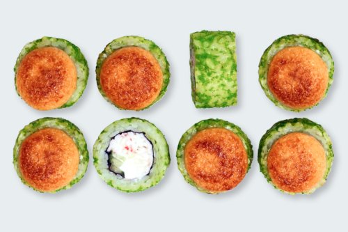 Соус Унаги придает пикантный вкус лососю, а сливочный сыр и хрустящая корочка завершают вкусовой ансамбль.